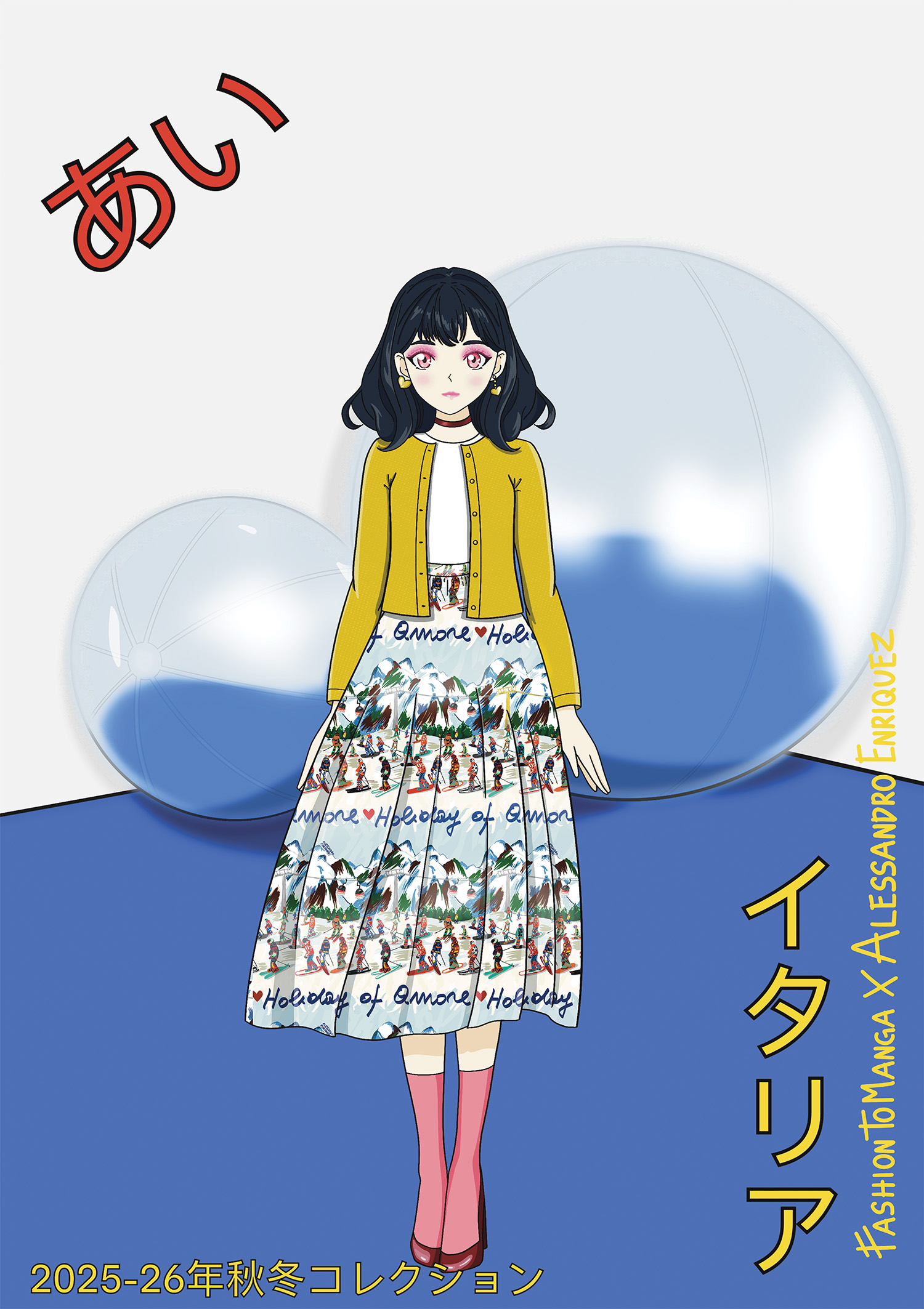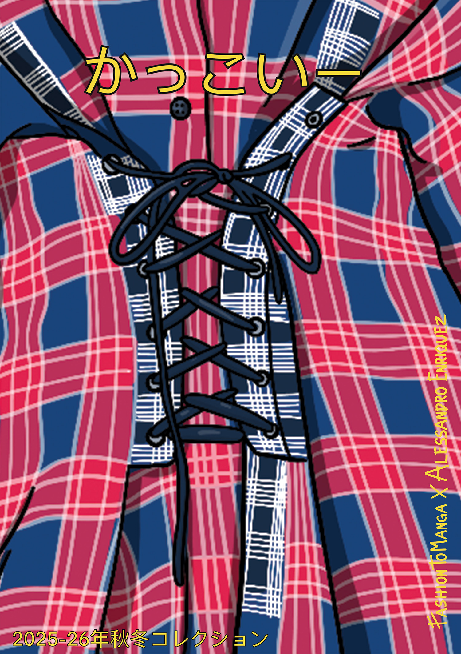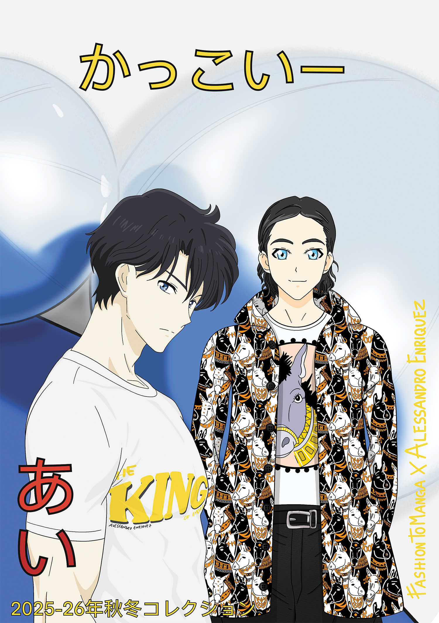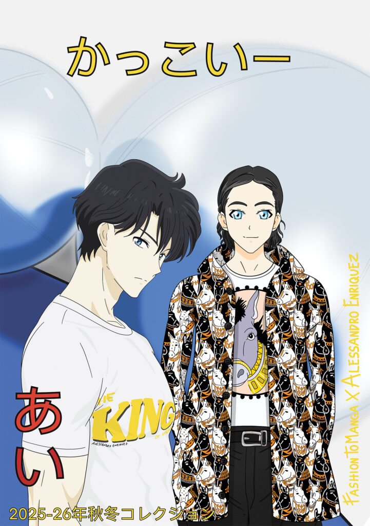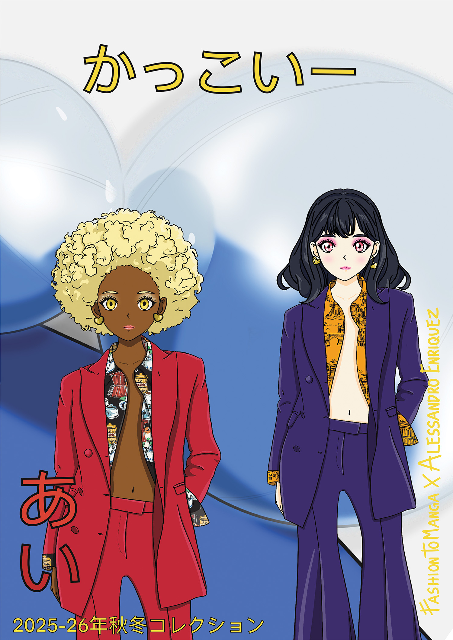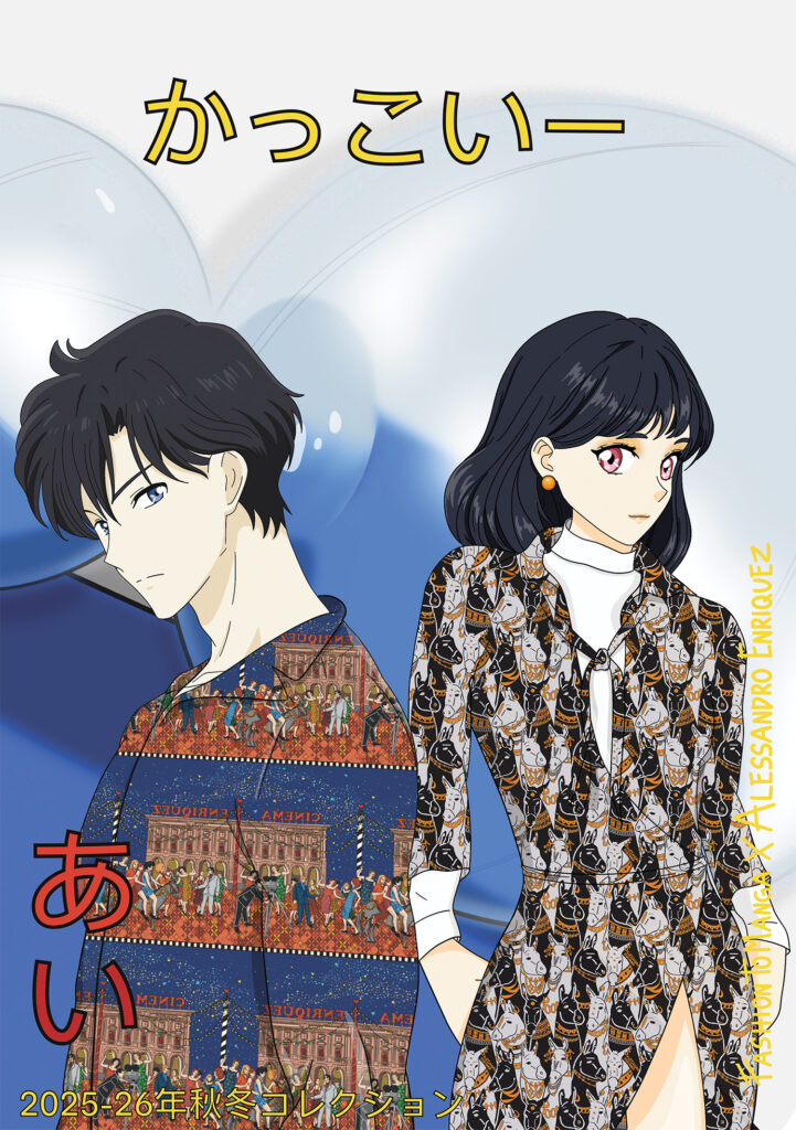 Le illustrazioni cartoon della nuova collezione F-W 2025/2026 del designer Alessandro Enriquez sono state realizzate dal giovane artista Giovanni Valenti @fashiontomanga.